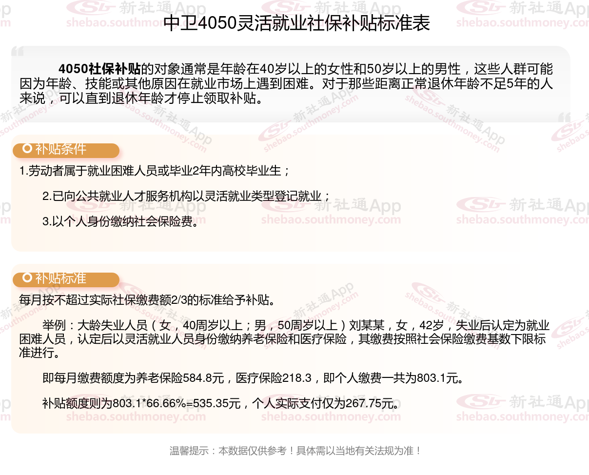 二、中卫4050社保补贴标准及条件(2025年最新)