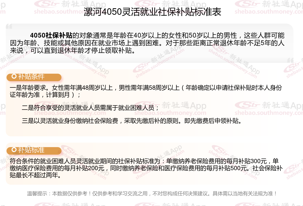 二、2025年漯河4050社保补贴标准及条件,最新如下: