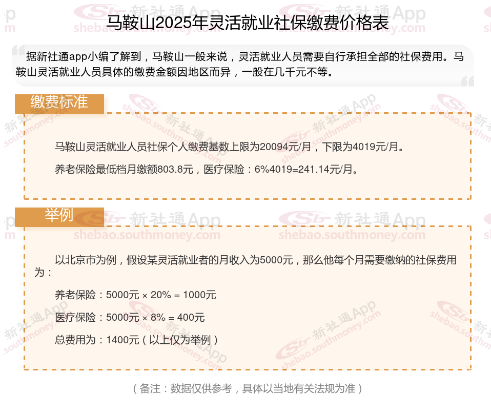 马鞍山灵活就业社保缴费标准,马鞍山社保缴费多少钱?下表是2024-2025年马鞍山社保费用明细参考,根据新社通app-社保缴费查询工具提供的最新数据如下: