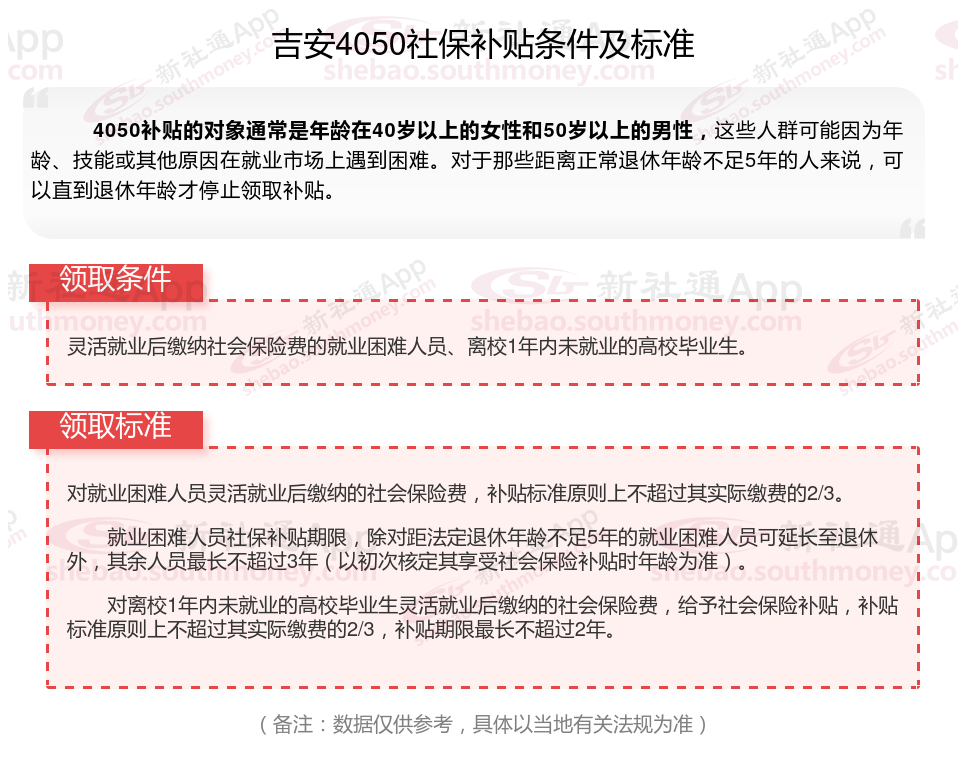 二、2025年吉安4050社保补贴标准及条件,最新如下: