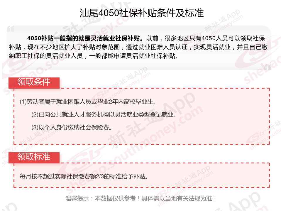二、2025年汕尾4050社保补贴标准及条件,最新如下: