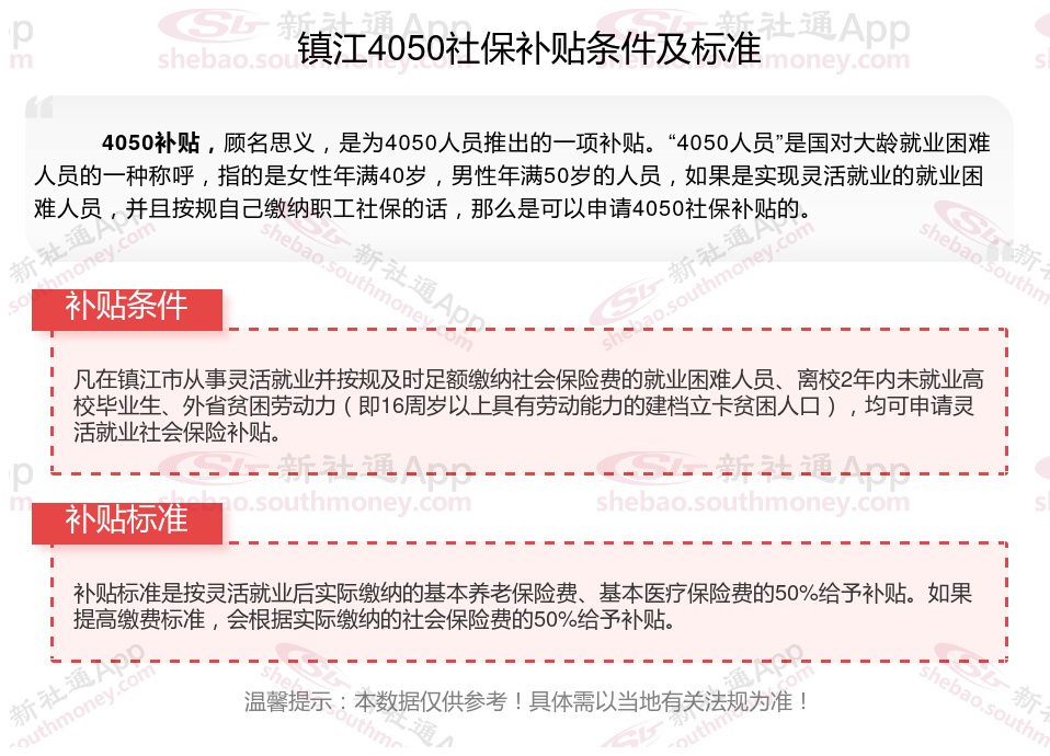 二、2025年镇江4050社保补贴标准及条件,最新如下: