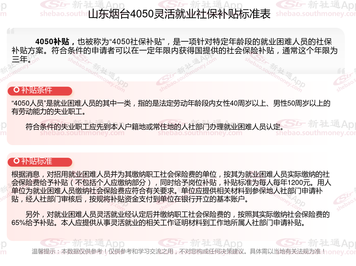 山东烟台4050灵活就业社保补贴是什么?今天聊一下4050补贴话题。4050补贴听起来像是一个针对特定年龄人群的社保补贴。比如女性需年满40周岁,男性需年满50周岁(以申请当年12月31日为截止日期)。那么山东烟台4050灵活就业社保补贴标准是多少钱?山东烟台4050社保补贴可以领取多少?接下来随新社通APP小编了解一下山东烟台4050灵活就业社保补贴的最新资讯。