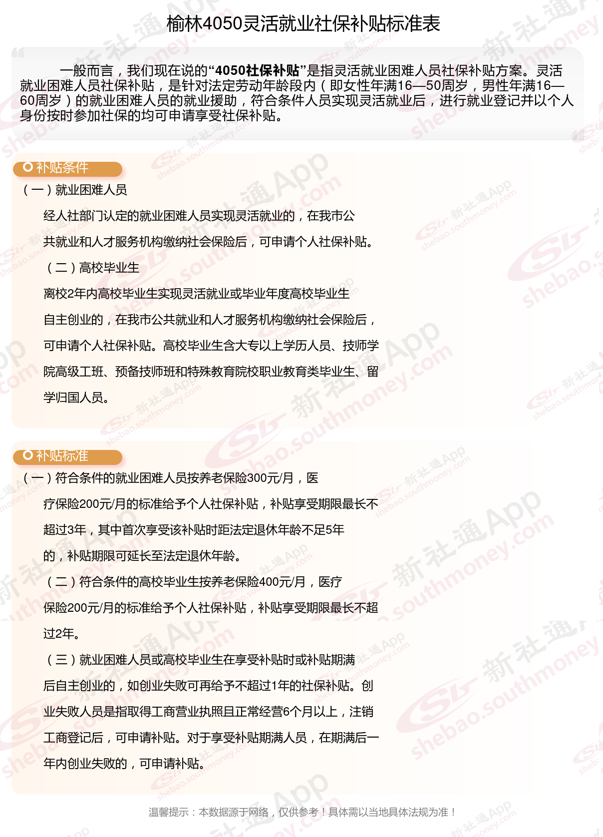 4050社保补贴标准据新社通app小编了解,通常,4050社保补贴包含基本医疗保险和基本养老保险两个险种,社保补贴金额为申请人实际缴纳基本养老保险和基本医疗保险金额的2/3,具体标准以当地社保局公布的数据为准!那么榆林灵活就业人员4050补贴最新标准是多少,榆林4050灵活就业人员社保补贴一年可以有多少钱?接下来随新社通APP小编具体了解一下4050社保补贴内容。