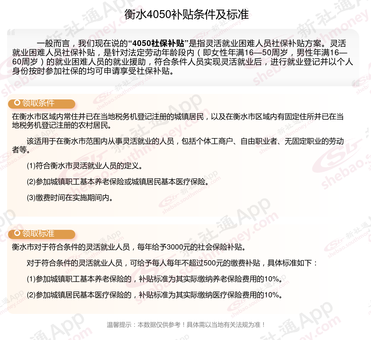 衡水4050灵活就业社保补贴是什么?今天聊一下4050补贴话题。44050社保补贴标准据新社通app小编了解,通常,4050社保补贴包含基本医疗保险和基本养老保险两个险种,社保补贴金额为申请人实际缴纳基本养老保险和基本医疗保险金额的2/3,具体标准以当地社保局公布的数据为准!那么衡水4050灵活就业社保补贴标准是多少钱?衡水4050社保补贴可以领取多少?接下来随新社通APP小编了解一下衡水4050灵活就业社保补贴的最新资讯。