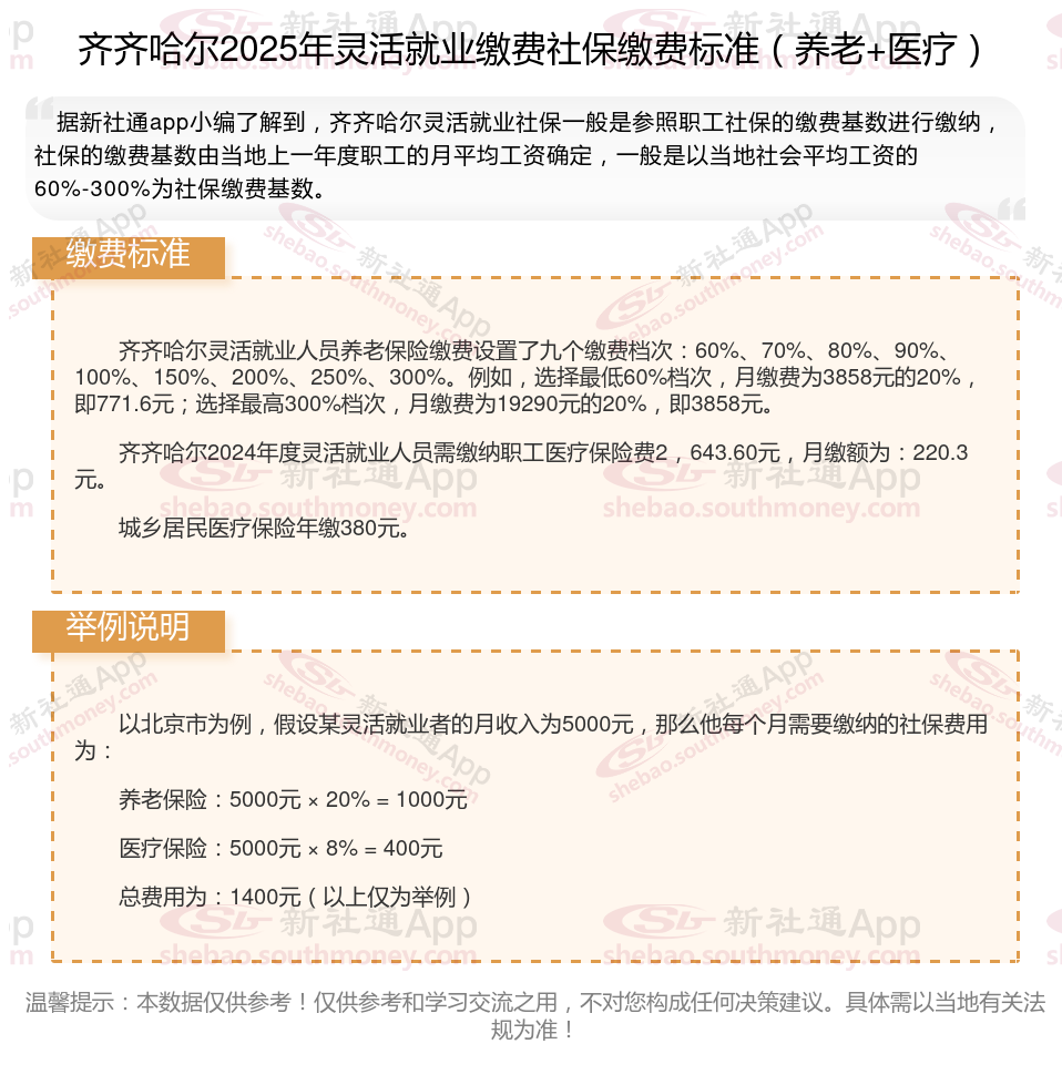 齐齐哈尔社保缴费多少钱?下表是2024-2025年齐齐哈尔社保费用明细参考,根据新社通app-社保缴费查询工具提供的最新数据如下: