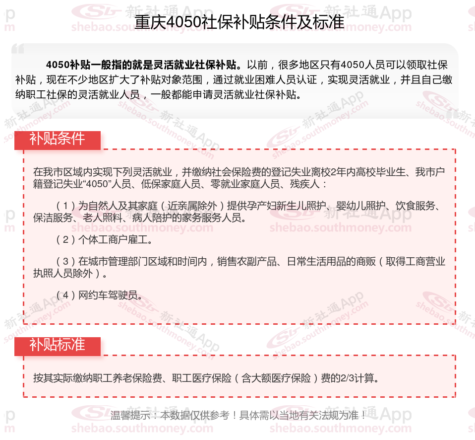 今天聊一下4050补贴话题。4050补贴听起来像是一个针对特定年龄人群的社保补贴。比如女性需年满40周岁,男性需年满50周岁(以申请当年12月31日为截止日期)。那么重庆4050灵活就业社保补贴标准是多少钱?重庆4050社保补贴条件是什么?接下来随新社通APP小编了解一下最新资讯。