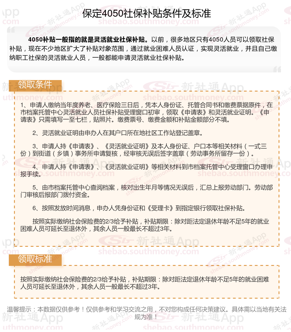 4050补贴主要是针对大龄就业困难人群的社保补贴,申请条件包括年龄、就业困难、灵活就业并自费缴纳社保,需要持有失业登记证,不同地区可能有细微差别,比如农村户口的限制。那么保定4050灵活就业社保补贴标准是多少钱?保定4050社保补贴条件是什么?接下来随新社通APP小编了解一下最新资讯。