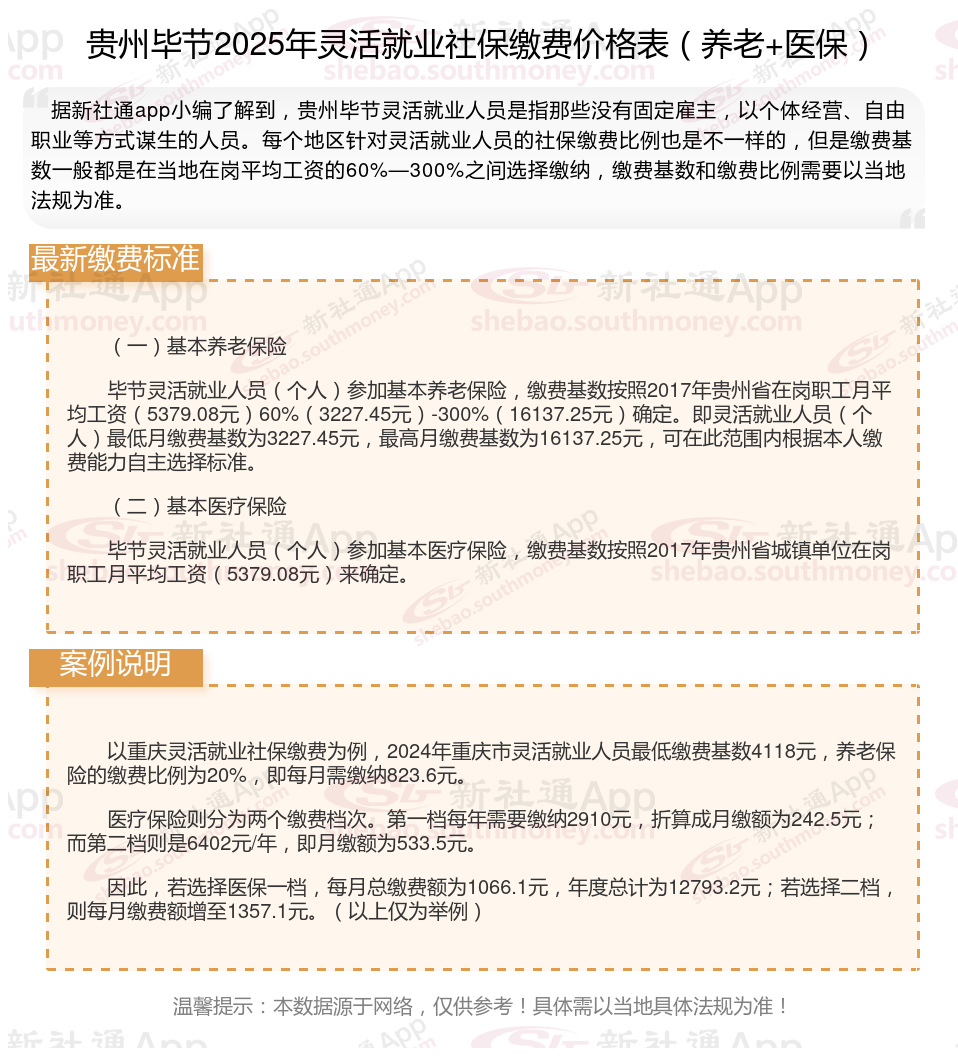贵州毕节社保缴费多少钱?下表是2024-2025年贵州毕节社保费用明细参考,根据新社通app-社保缴费查询工具提供的最新数据如下: