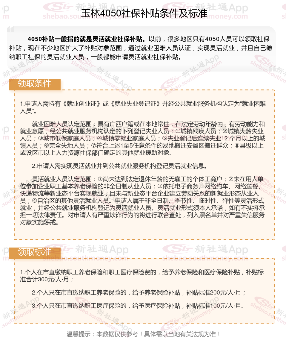 一、2023-2024年玉林4050社保补贴标准及条件,最新如下