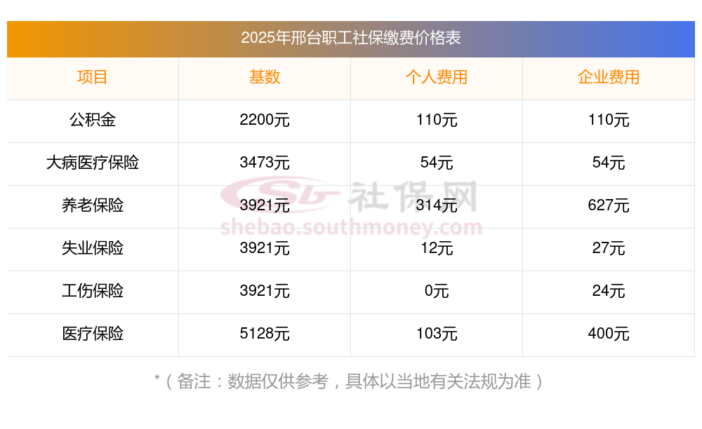 2025社保交多少钱?下表是2025年邢台社保费用明细参考,新社通app-社保缴费查询工具提供的最新数据如下: