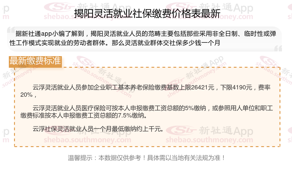 揭阳灵活就业社保2025年收费标准是多少钱,主要由当地的在岗平均工资和缴费基数来定。其次,灵活就业社保缴纳跟职工缴纳不同的地方在于,灵活就业社保参保只能参保养老保险和医疗保险,且缴纳比例完全由个人承担。另外,灵活就业人员社保参保选择,可自由选择参保城镇职工社保和城乡居民保险。2025年揭阳灵活就业社保缴多少钱?如何缴纳?怎么计算待遇?新社通APP小编将在下文为您详细说明。
