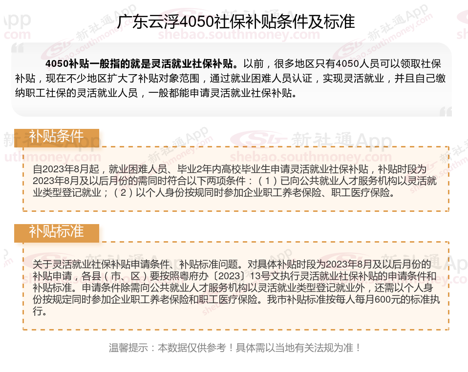 4050补贴需要以灵活就业身份参加职工养老和医疗保险,补贴标准不超过实际缴费的三分之二,最长3年,距离退休不足5年的可延长到退休。补贴对象包括国企下岗人员、低保家庭等。申请流程需要提交身份证、银行账户等。那么广东云浮4050灵活就业社保补贴标准是多少钱?广东云浮4050社保补贴条件是什么?接下来随新社通APP小编了解一下最新资讯。