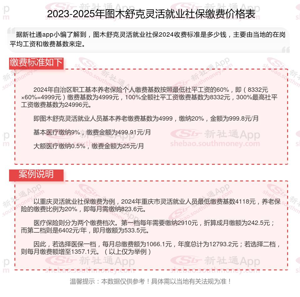 图木舒克社保缴费多少钱?下表是2024-2025年图木舒克社保费用明细参考,根据新社通app-社保缴费查询工具提供的最新数据如下: