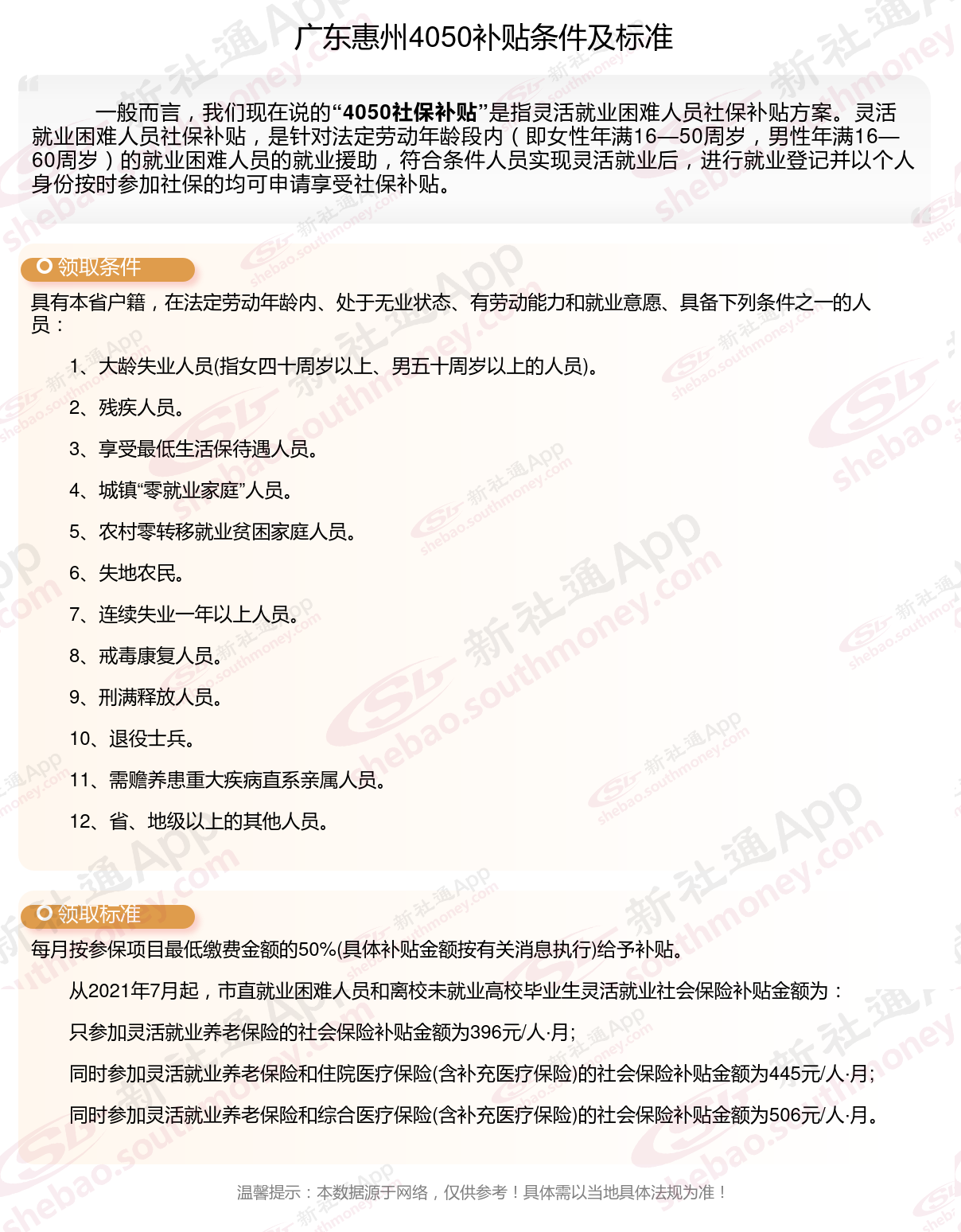 多数地区只有4050人员可以领取社保补贴,现在扩大了补贴对象及范围,通过就业困难人员认证,实现灵活就业,并且自己缴纳职工社保的灵活就业人员,一般都能申请灵活就业社保补贴。那么广东惠州4050灵活就业社保补贴标准是多少钱?广东惠州4050社保补贴条件是什么?接下来随新社通APP小编了解一下最新资讯。