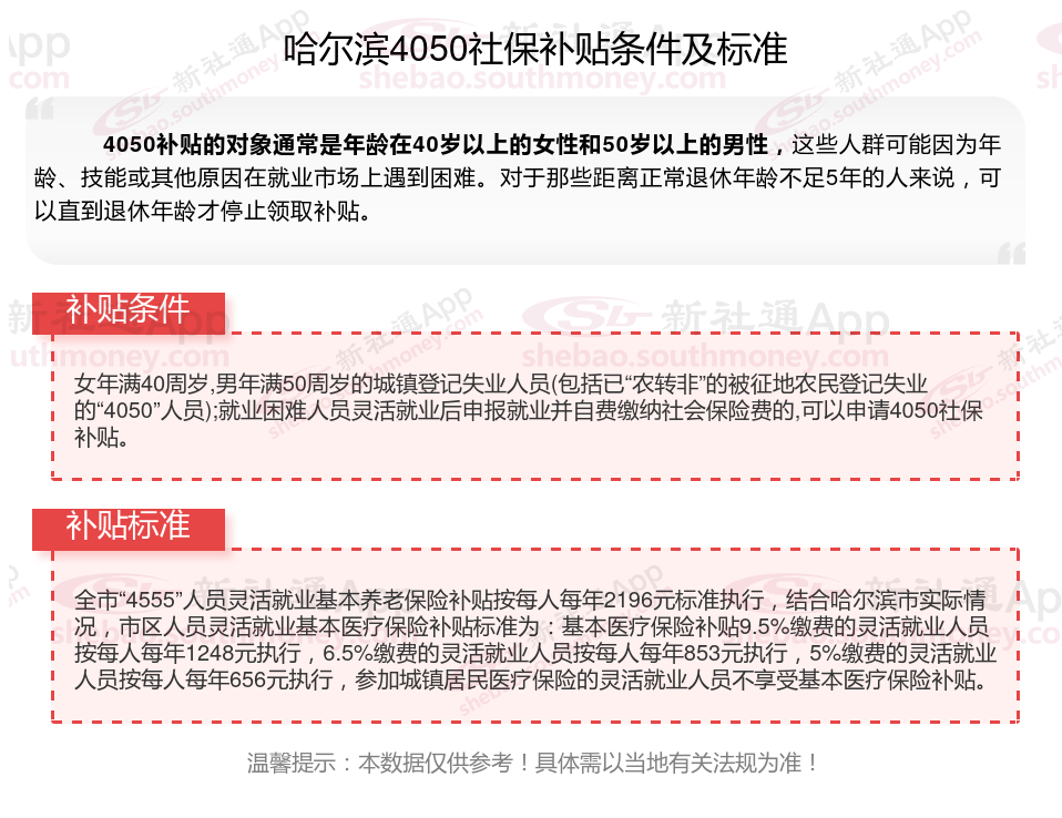 一、2025年哈尔滨灵活就业4050社保补贴标准及条件是什么