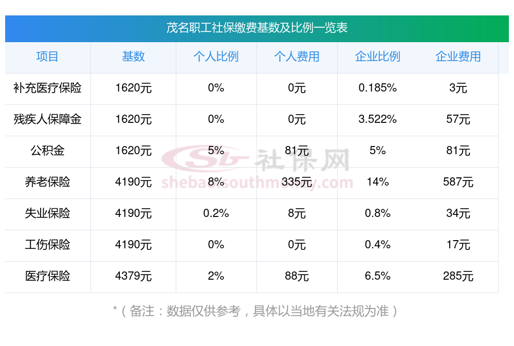 2025年茂名社保缴费多少钱?茂名社保公积金缴费基数为:3579.00元,个人比例:0.08,下表是2025茂名社保费用明细参考,新社通app-社保缴费查询工具提供的最新数据如下: