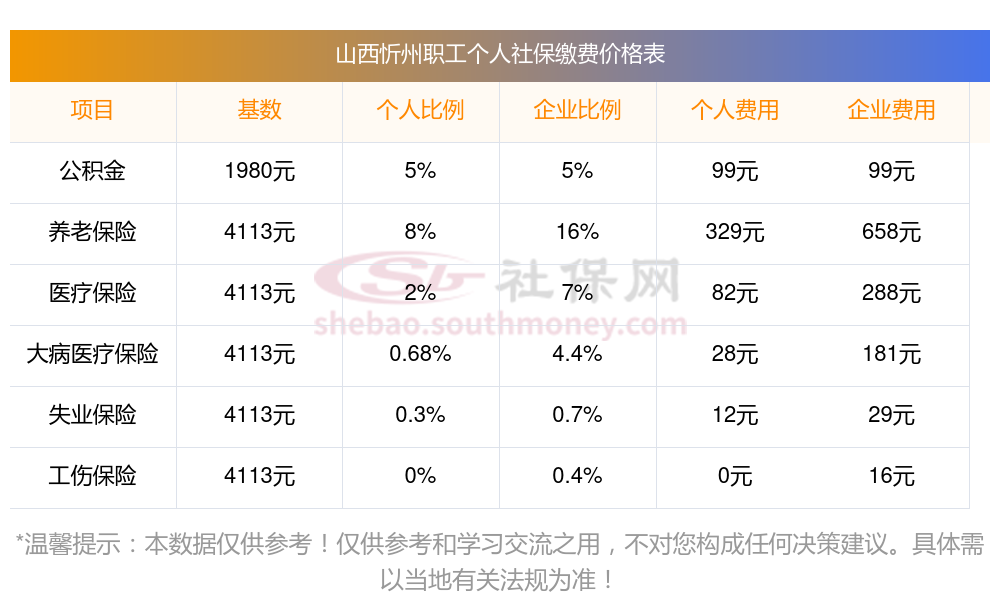 2025年山西忻州社保缴费多少钱?下表是2023-2024年山西忻州社保费用明细参考,如下: