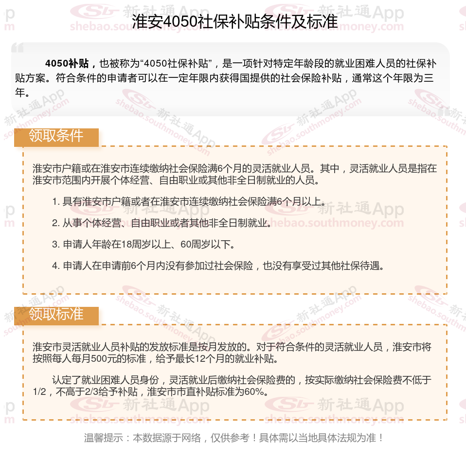 二、2025年淮安4050社保补贴标准及条件,最新如下: