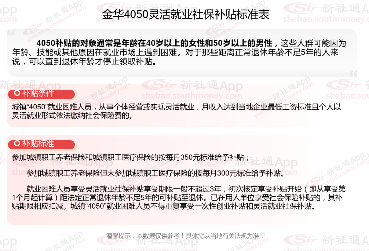 今天聊一下4050补贴的相关内容。4050补贴听起来像是一个针对特定年龄人群的社保补贴。比如女性需年满40周岁,男性需年满50周岁(以申请当年12月31日为截止日期)。那么金华4050灵活就业困难人员社保补贴多少钱?金华4050社保补贴可以申请吗?接下来随新社通APP小编具体了解一下4050社保补贴内容。