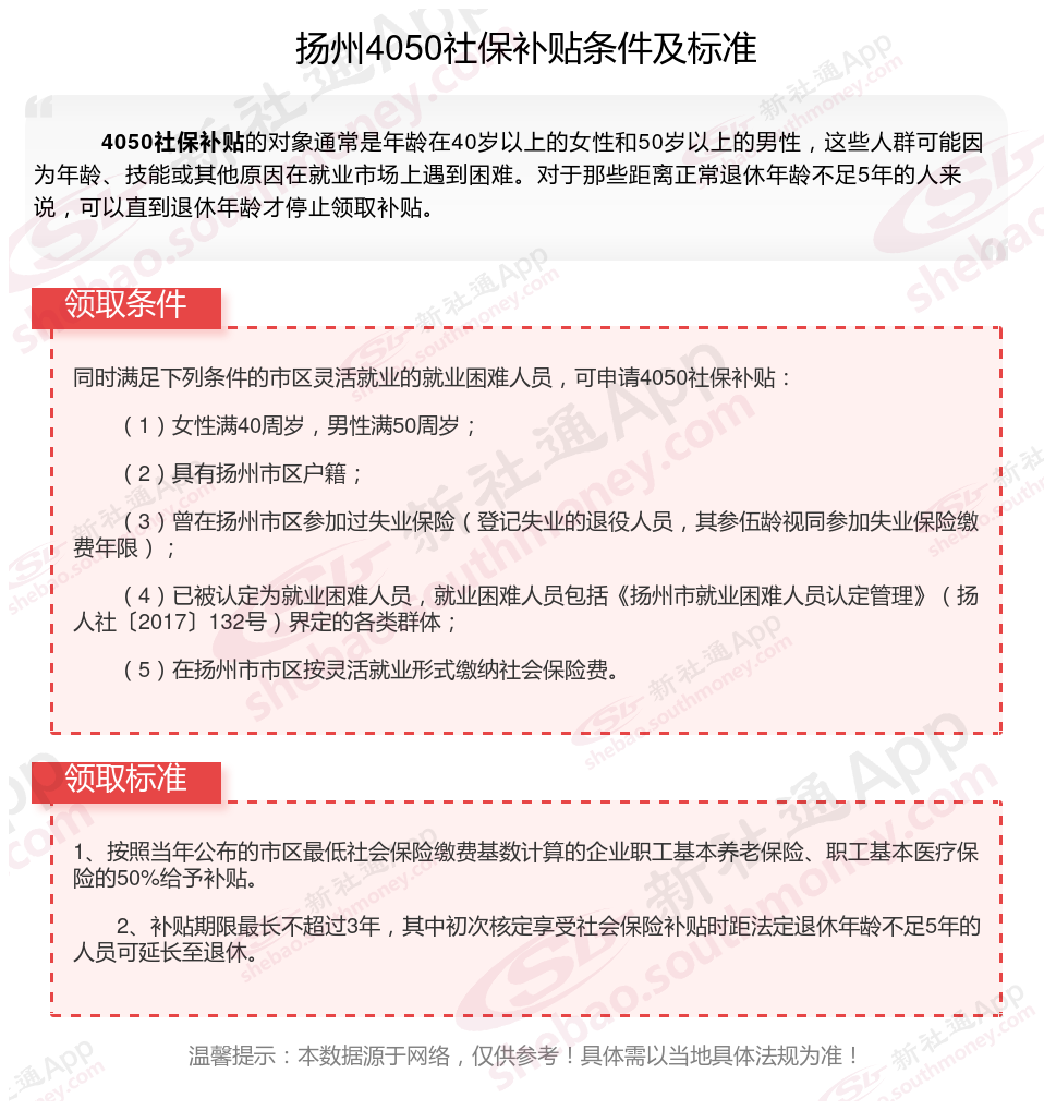 扬州4050灵活就业社保补贴是什么?今天聊一下4050补贴话题。44050社保补贴标准据新社通app小编了解,通常,4050社保补贴包含基本医疗保险和基本养老保险两个险种,社保补贴金额为申请人实际缴纳基本养老保险和基本医疗保险金额的2/3,具体标准以当地社保局公布的数据为准!那么扬州4050灵活就业社保补贴标准是多少钱?扬州4050社保补贴可以领取多少?接下来随新社通APP小编了解一下扬州4050灵活就业社保补贴的最新资讯。