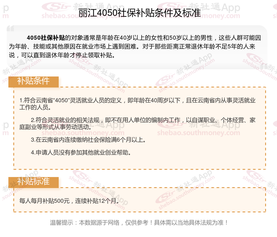 多数地区只有4050人员可以领取社保补贴,现在扩大了补贴对象及范围,通过就业困难人员认证,实现灵活就业,并且自己缴纳职工社保的灵活就业人员,一般都能申请灵活就业社保补贴。那么丽江4050灵活就业社保补贴标准是多少钱?丽江4050社保补贴条件是什么?接下来随新社通APP小编了解一下最新资讯。