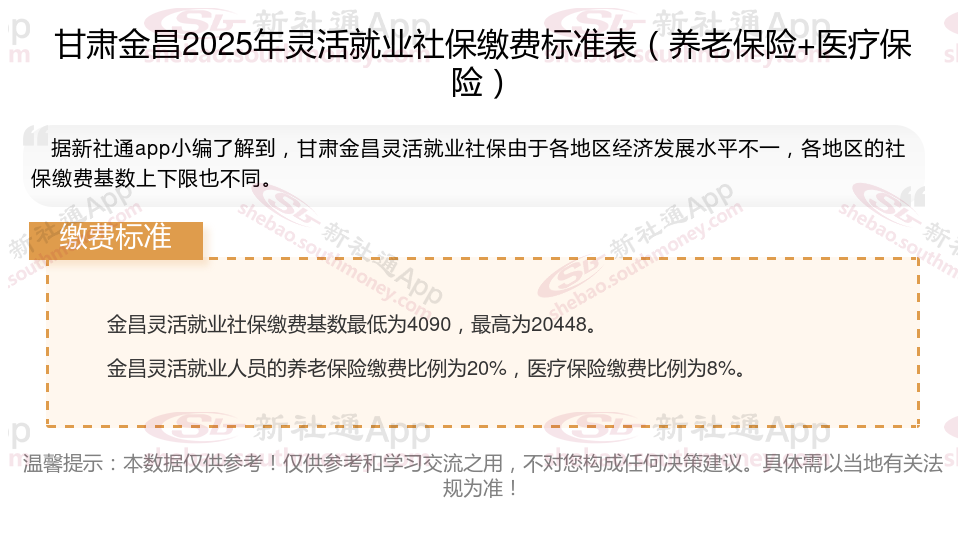 据新社通app数据显示,甘肃金昌灵活就业养老保险缴费基数2024-2025年最新标准如下: