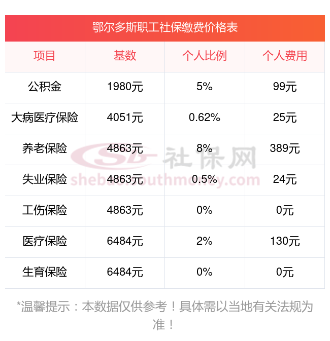 内蒙古鄂尔多斯缴费社保比例一览 社保公司和个人各交多少?下表是2024-2025年内蒙古鄂尔多斯社保费用明细参考,新社通app-社保缴费查询工具提供的最新数据如下: