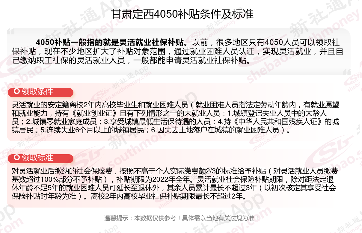 二、2025年甘肃定西4050社保补贴标准(甘肃定西4050灵活就业人员补贴标准是多少钱?甘肃定西2025年4050补贴新规能领多少钱?)