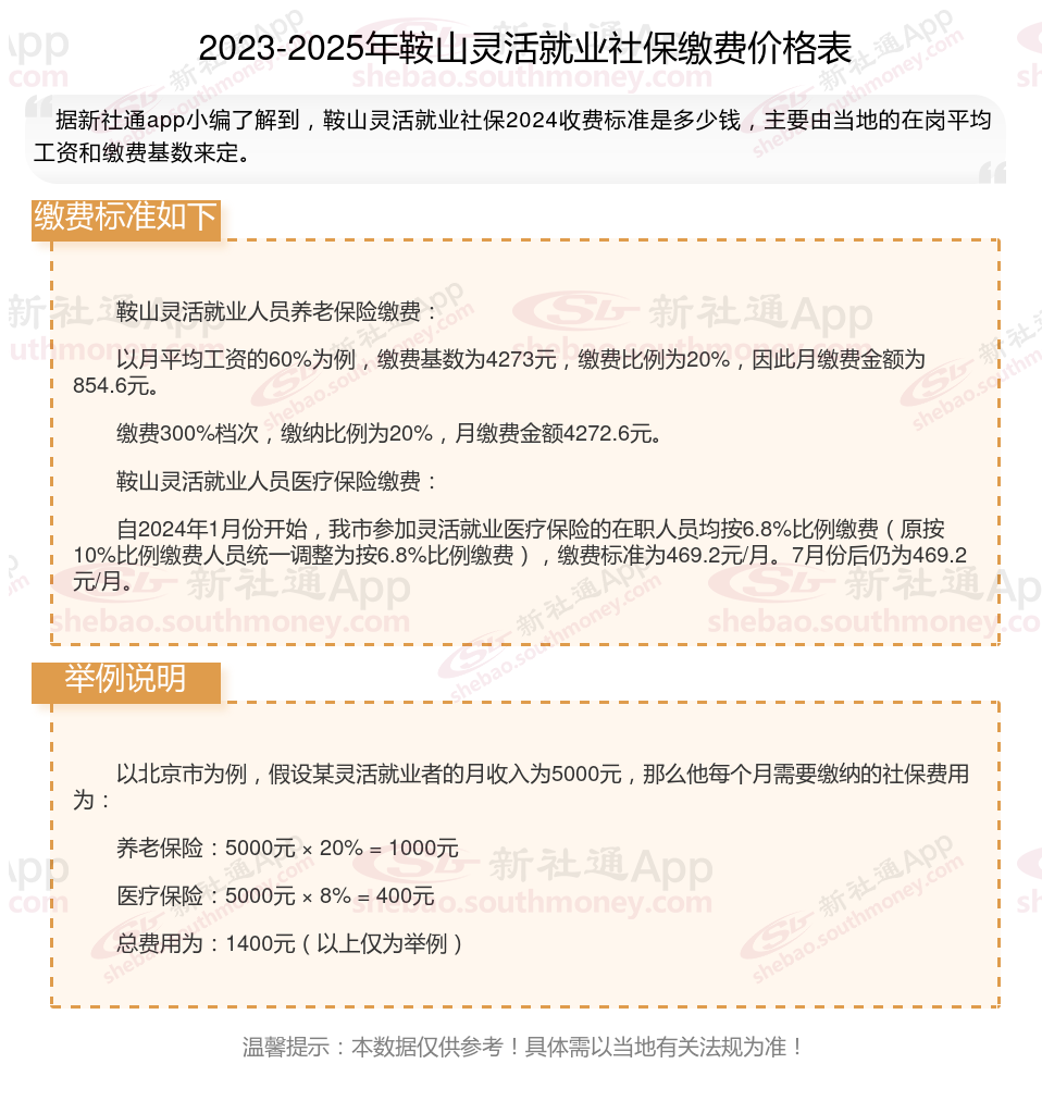据新社通app数据显示,鞍山灵活就业养老保险缴费基数2024-2025年最新标准如下:
