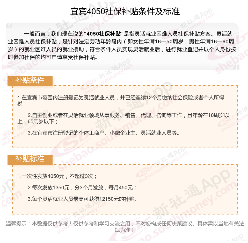 4050补贴主要是针对大龄就业困难人群的社保补贴,申请条件包括年龄、就业困难、灵活就业并自费缴纳社保,需要持有失业登记证,不同地区可能有细微差别,比如农村户口的限制。那么宜宾4050灵活就业社保补贴标准是多少钱?宜宾4050社保补贴条件是什么?接下来随新社通APP小编了解一下最新资讯。