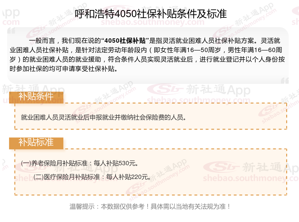 4050社保补贴标准据新社通app小编了解,通常,4050社保补贴包含基本医疗保险和基本养老保险两个险种,社保补贴金额为申请人实际缴纳基本养老保险和基本医疗保险金额的2/3,具体标准以当地社保局公布的数据为准!那么呼和浩特4050灵活就业困难人员社保补贴标准是多少?呼和浩特4050社保补贴需要符合什么条件?接下来随新社通APP小编具体了解一下4050社保补贴内容。