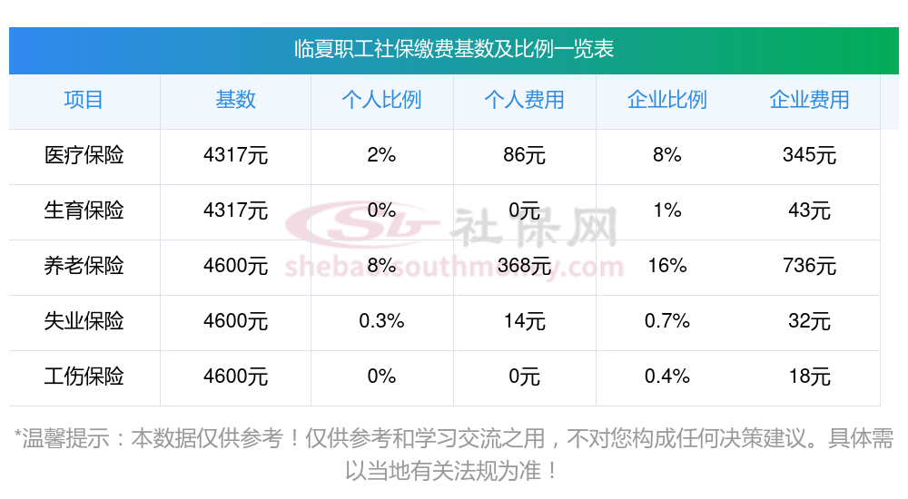根据新社通app-社保缴费查询工具提供的最新数据,临夏地区2025年的社保缴费标准已经确定。以下是各项保险的缴费比例及相应金额(基于一定的缴费基数)的详细说明: