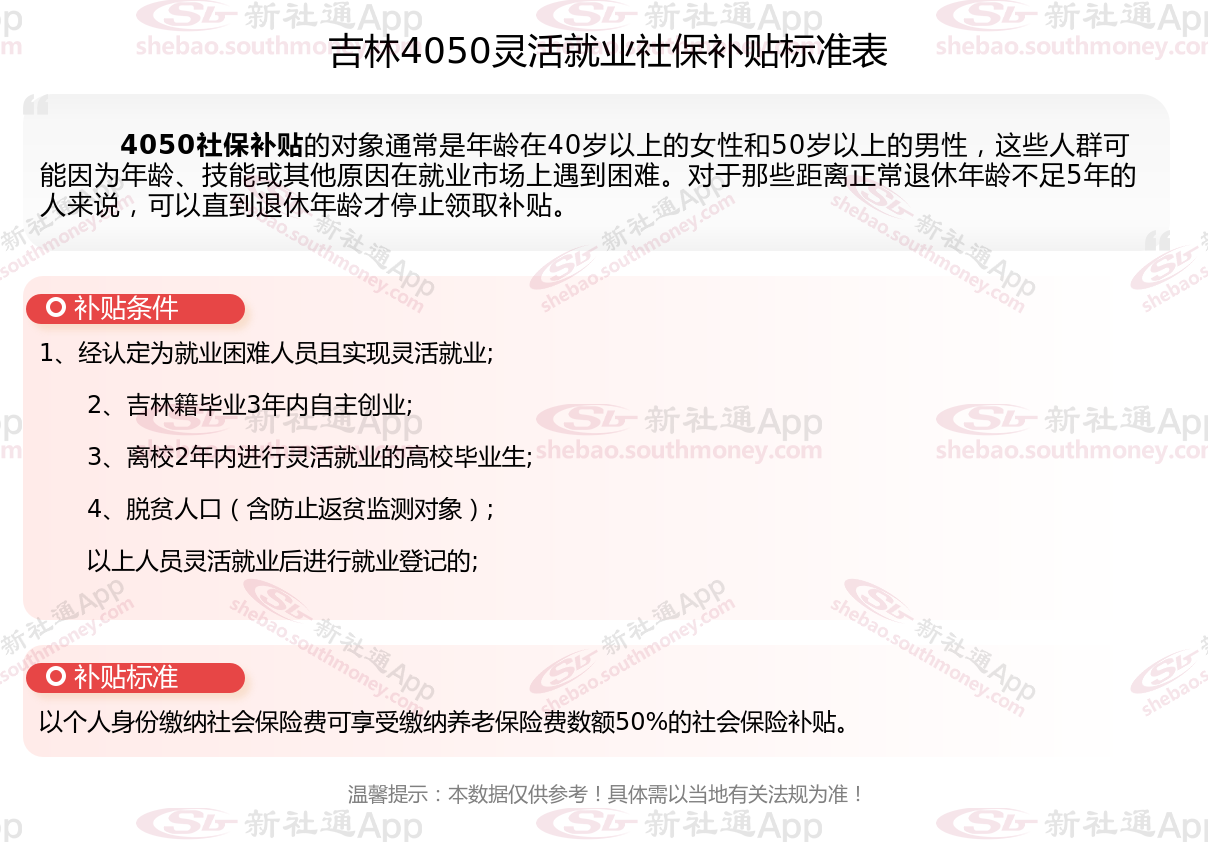 “灵活就业4050社保补贴”是指灵活就业困难人员社保补贴。该方案是对就业困难人员灵活就业后办理了就业登记手续并参加社会保险的,给予社会保险补贴。那么吉林4050灵活就业困难人员社保补贴标准是多少?吉林4050社保补贴需要符合什么条件?接下来随新社通APP小编了解一下最新资讯。
