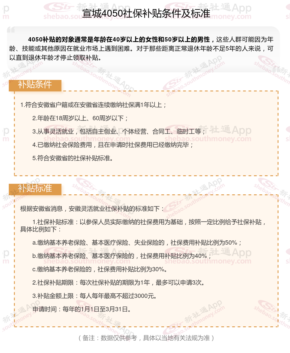 二、宣城4050社保补贴标准及条件4050社保补贴,最新如下