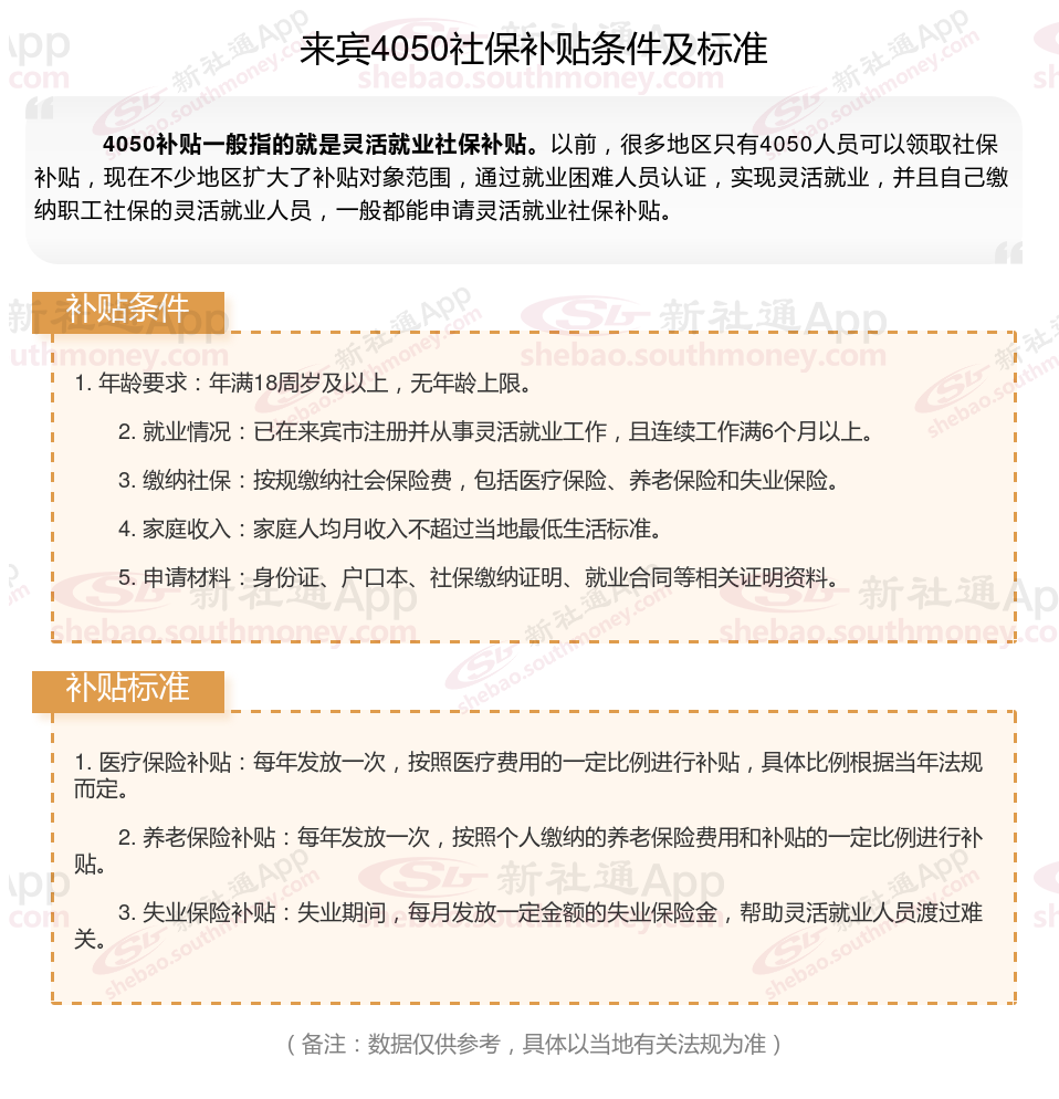 今天聊一下4050补贴的相关内容。4050补贴听起来像是一个针对特定年龄人群的社保补贴。比如女性需年满40周岁,男性需年满50周岁(以申请当年12月31日为截止日期)。那么来宾4050灵活就业困难人员社保补贴多少钱?来宾4050社保补贴可以申请吗?接下来随新社通APP小编具体了解一下4050社保补贴内容。