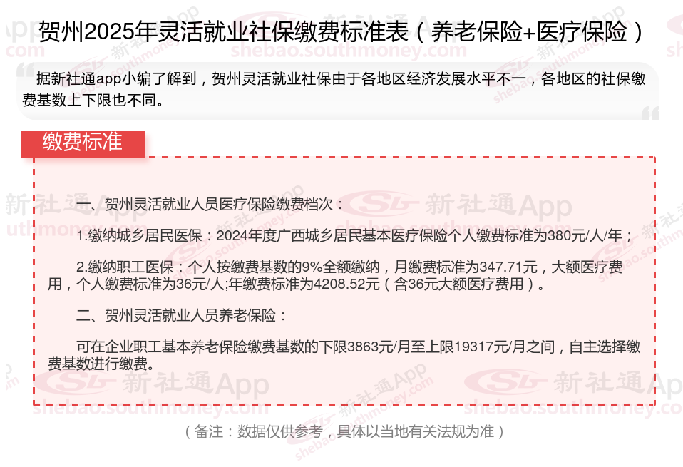 据新社通app数据显示,贺州灵活就业养老保险缴费基数2024-2025年最新标准如下: