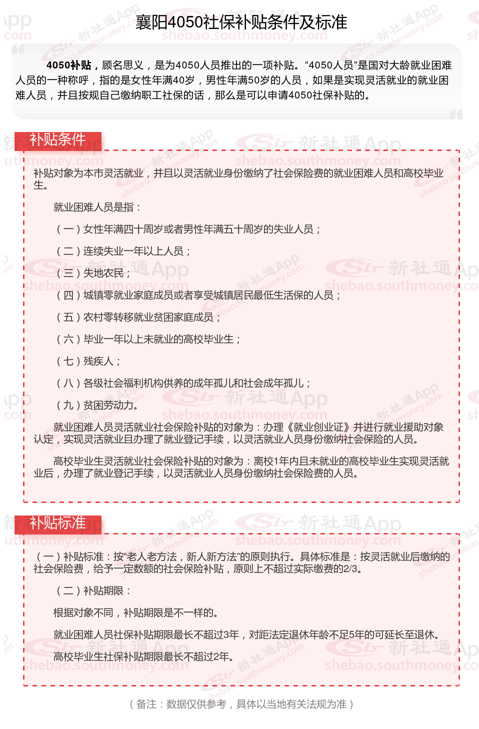 4050补贴需要以灵活就业身份参加职工养老和医疗保险,补贴标准不超过实际缴费的三分之二,最长3年,距离退休不足5年的可延长到退休。补贴对象包括国企下岗人员、低保家庭等。申请流程需要提交身份证、银行账户等。那么襄阳4050灵活就业社保补贴标准是多少钱?襄阳4050社保补贴条件是什么?接下来随新社通APP小编了解一下最新资讯。
