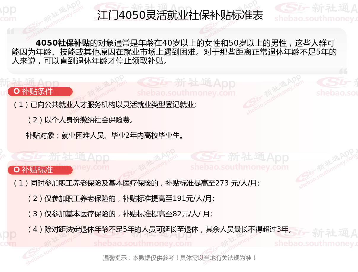 今天聊一下4050补贴话题。4050补贴听起来像是一个针对特定年龄人群的社保补贴。比如女性需年满40周岁,男性需年满50周岁(以申请当年12月31日为截止日期)。那么江门4050灵活就业社保补贴标准是多少钱?江门4050社保补贴条件是什么?接下来随新社通APP小编了解一下最新资讯。