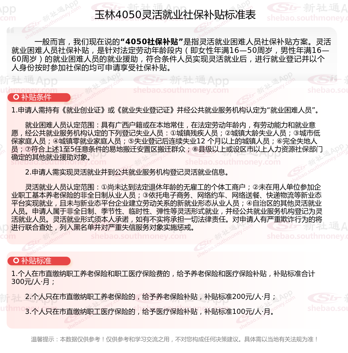 一、2025年玉林灵活就业4050社保补贴标准是多少?申请条件是什么?