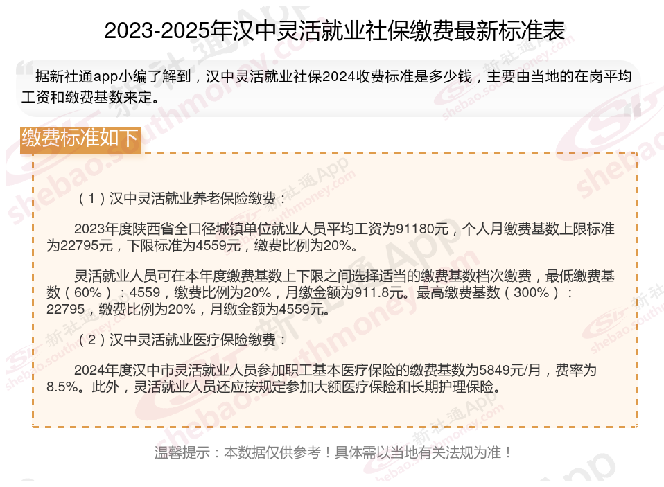 据新社通app数据显示,2024-2025年汉中灵活就业人员养老保险的缴费标准: