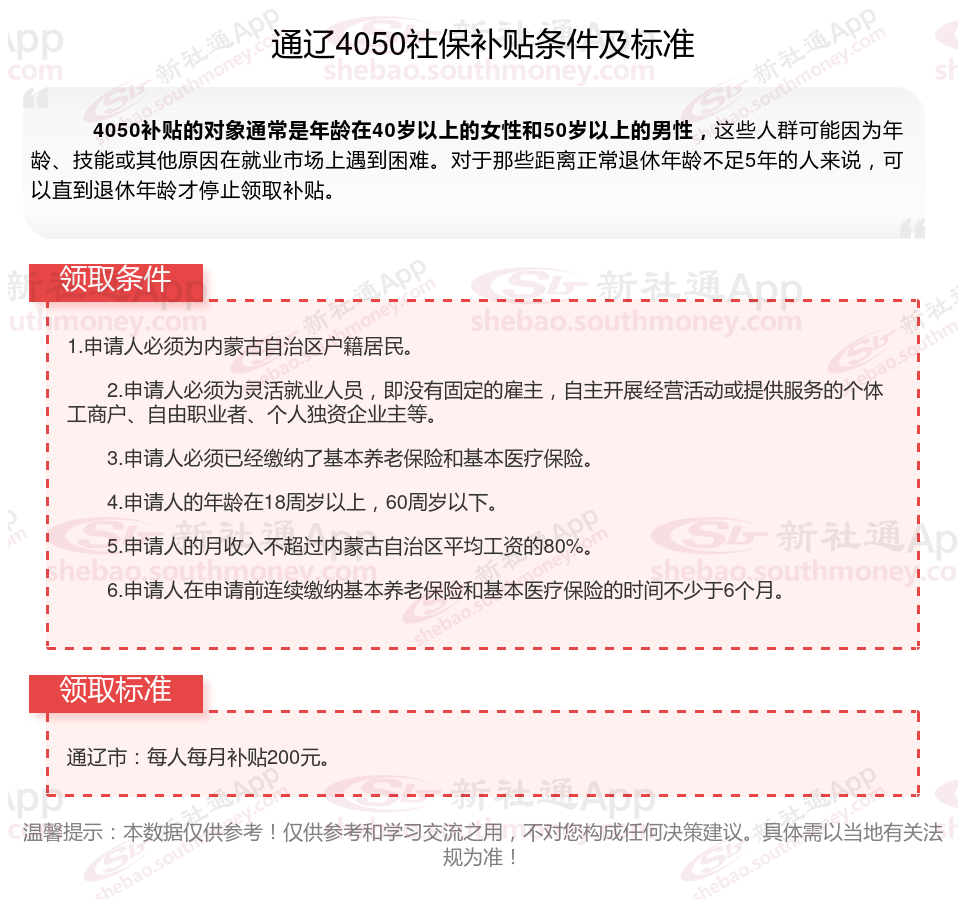 通辽4050灵活就业社保补贴是什么?今天聊一下4050补贴话题。4050补贴听起来像是一个针对特定年龄人群的社保补贴。比如女性需年满40周岁,男性需年满50周岁(以申请当年12月31日为截止日期)。那么通辽4050灵活就业社保补贴标准是多少钱?通辽4050社保补贴可以领取多少?接下来随新社通APP小编了解一下通辽4050灵活就业社保补贴的最新资讯。