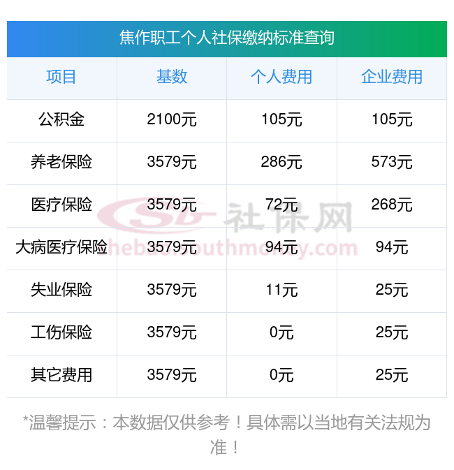 焦作2025年养老保险缴费标准是多少?下表是2025年焦作社保费用明细参考,新社通app-社保缴费查询工具提供的最新数据如下: