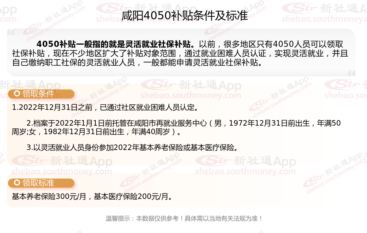 二、2025年咸阳4050社保补贴标准(咸阳4050灵活就业人员补贴标准是多少钱?咸阳2025年4050补贴新规能领多少钱?)