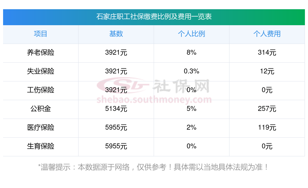2025年石家庄社保缴费最低基数及个人和单位具体是多少钱?下表是2025年石家庄社保费用明细参考,新社通app-社保缴费查询工具提供的最新数据如下: