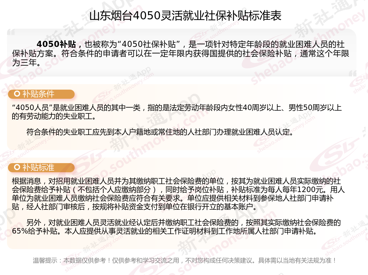 一、山东烟台4050社保补贴标准及条件是多少?