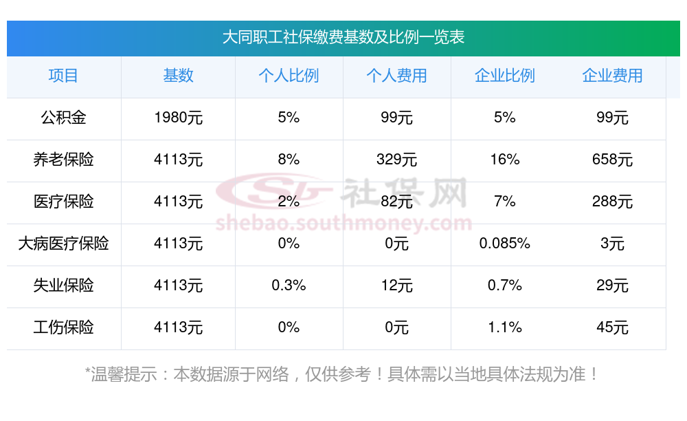 2025年大同5险缴费标准,2025年大同社保缴费多少钱?下表是2025年大同社保费用明细参考,新社通app-社保缴费查询工具提供的最新数据如下: