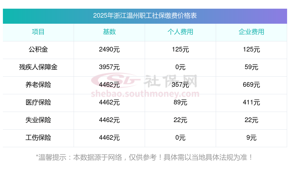 2025年浙江温州社保缴费多少钱?下表是2024-2025年浙江温州社保费用明细参考,新社通app-社保缴费查询工具提供的最新数据如下: