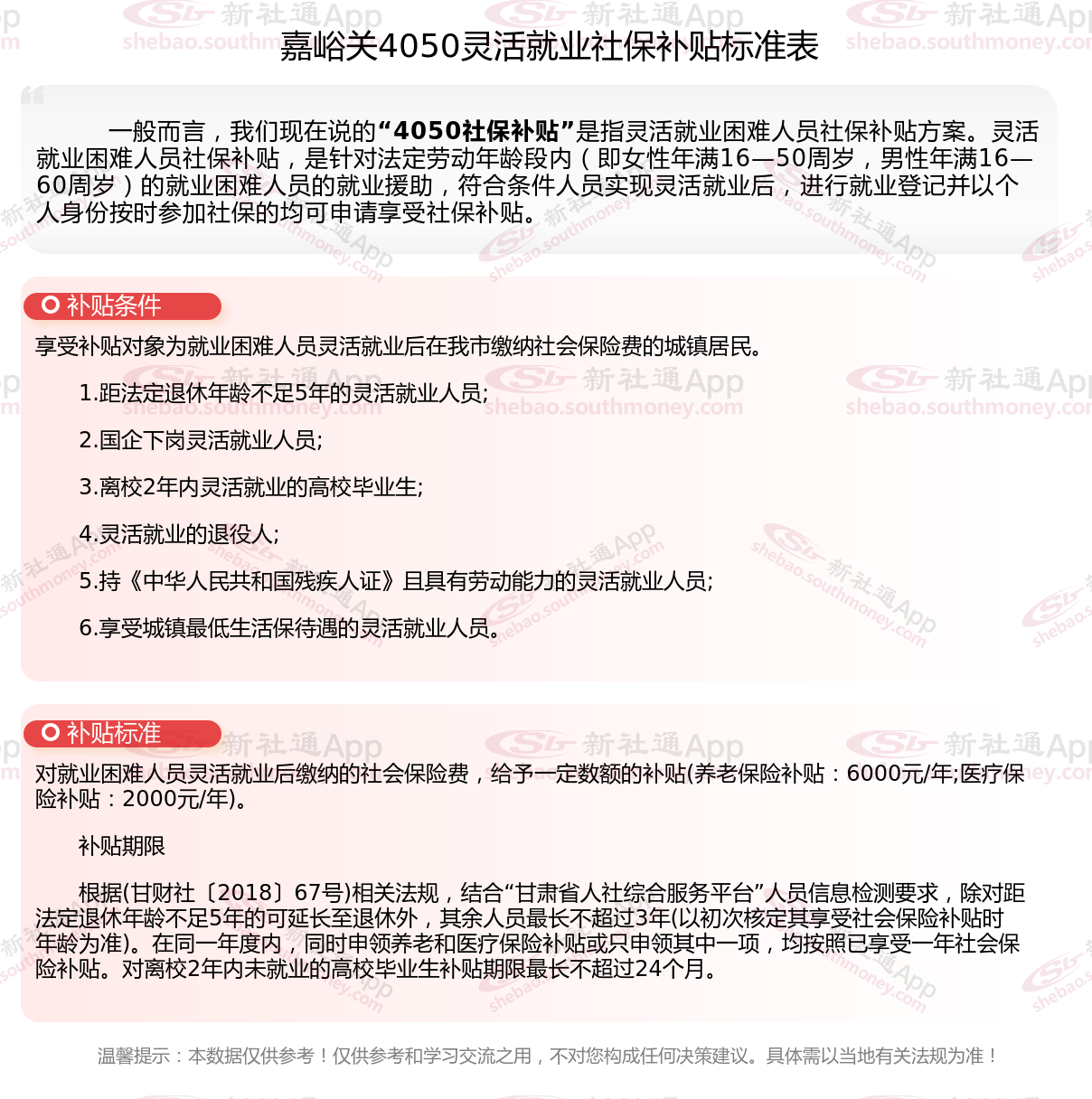 二、2025年嘉峪关4050社保补贴标准(嘉峪关4050灵活就业人员补贴标准是多少钱?嘉峪关2025年4050补贴新规能领多少钱?)