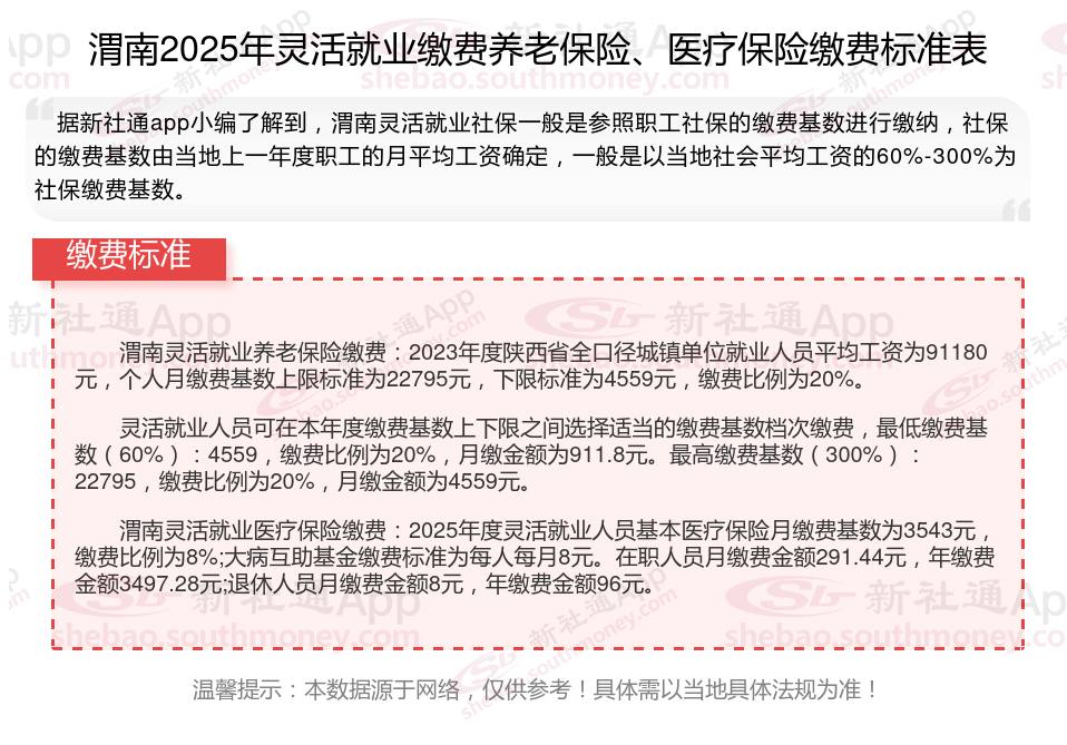 据新社通app数据显示,渭南灵活就业人员养老缴费基数2024-2025年最新标准如下: